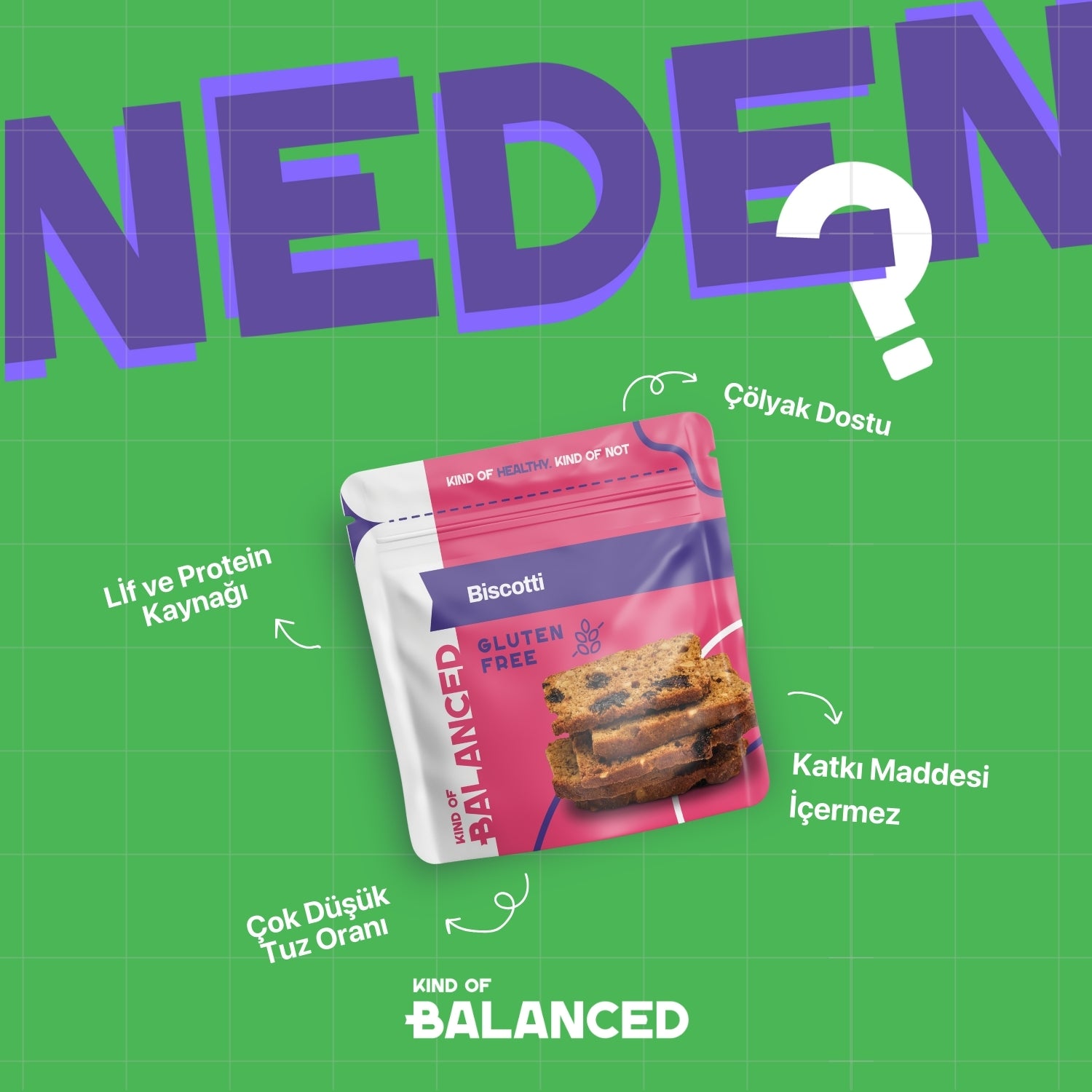 Kind Of Balanced Glütensiz Biscotti, özenle seçilen glütensiz un karışımının doğal tatlandırıcılarla bir araya getirilmesiyle üretilir. Üretimde mısır, pirinç ve patates nişastası bazlı unlar kullanılır ve içine antep fıstığı gibi lezzet verici bileşenler eklenir. Hamur kontrollü pişirme sürecinden geçirilerek biscotti kıvamına ulaşır; rafine şeker, koruyucu veya glutenli bileşenler içermez. Bu yöntem, ürünün hem doğal tadını hem de gevrek dokusunu korumasını sağlar.