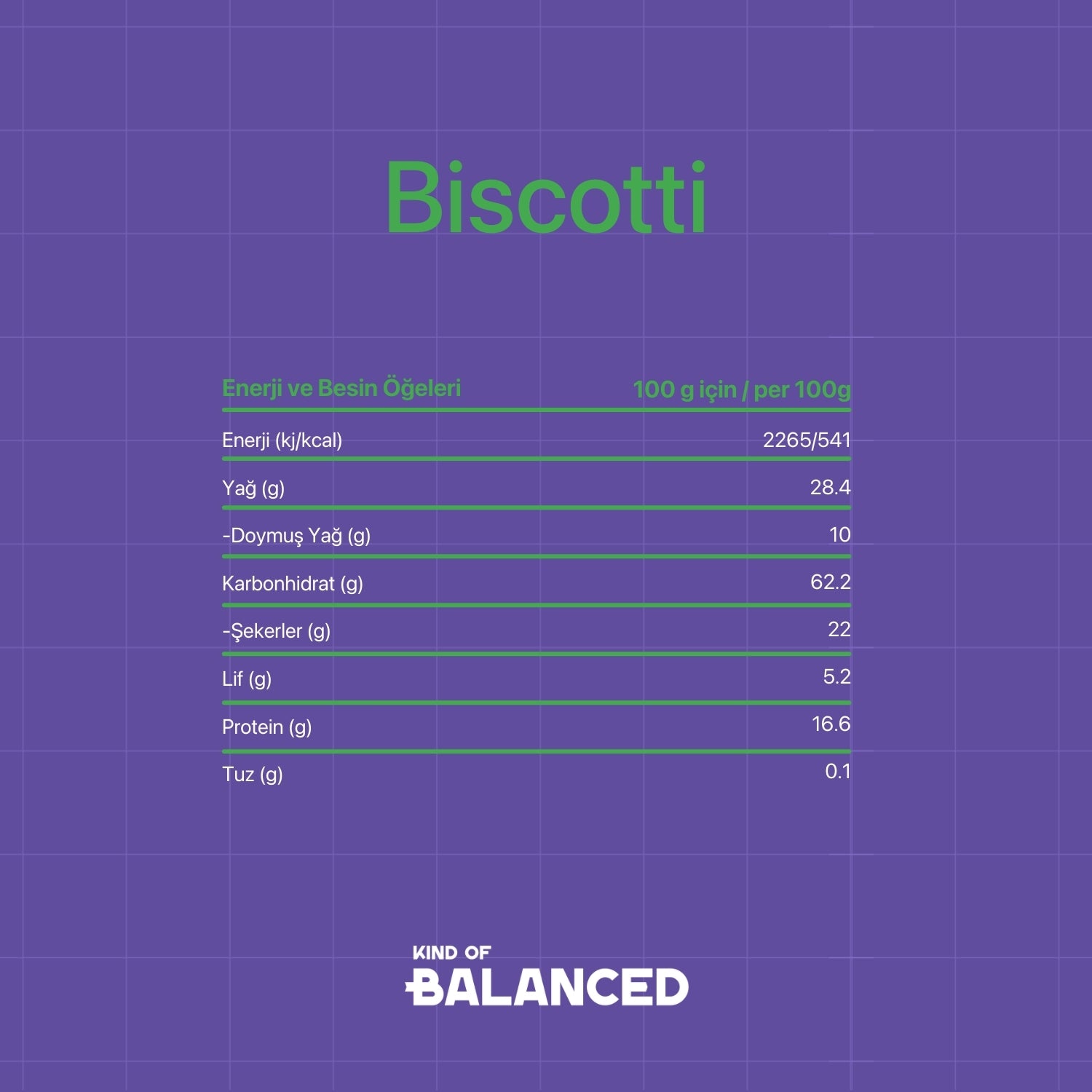Kind Of Balanced Glütensiz Biscotti, 50 gr’lık tek porsiyonluk yapısıyla günlük atıştırmalık ihtiyacını karşılamak için uygundur. Bir adet biscotti genellikle ara öğün ya da kahve/çay yanında keyifli bir lezzet deneyimi sağlar. Dengeli beslenme açısından porsiyon kontrolü önemlidir; bu nedenle tek seferde bir porsiyon tüketilmesi önerilir. Kişisel enerji ihtiyacı ve beslenme planına göre miktar ayarlanabilir, fakat porsiyon sınırını aşmamak dengeli bir tüketim sağlar.