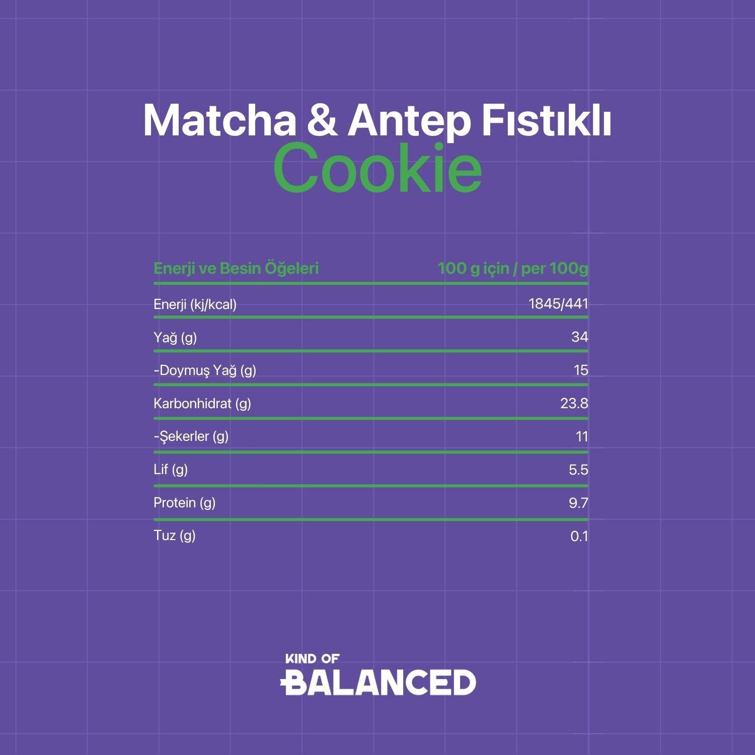 Badem unu, hindistan cevizi şekeri, hindistan cevizi yağı, badem sütü, antep fıstığı, karabuğday unu, matcha tozu, vanilya özütü, karbonat, tuz