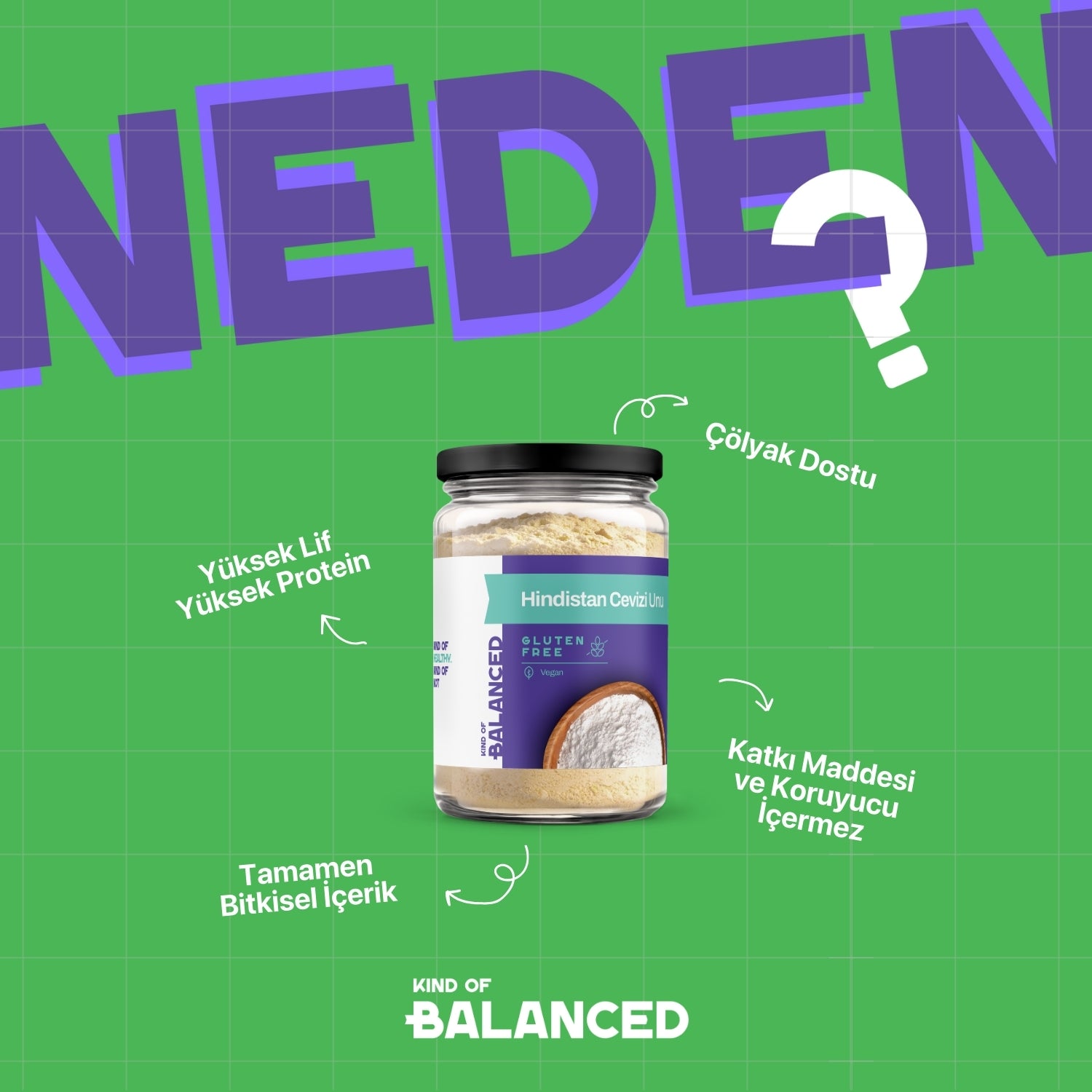 Kind of Balanced Hindistan Cevizi Unu, hindistan cevizinin etli kısmının nazikçe kurutulup öğütülmesiyle hazırlanır. Üretim sürecinde hiçbir katkı maddesi, rafine şeker veya koruyucu kullanılmaz. Bu sayede ürün doğal formunu, aromasını ve besin değerlerini korur