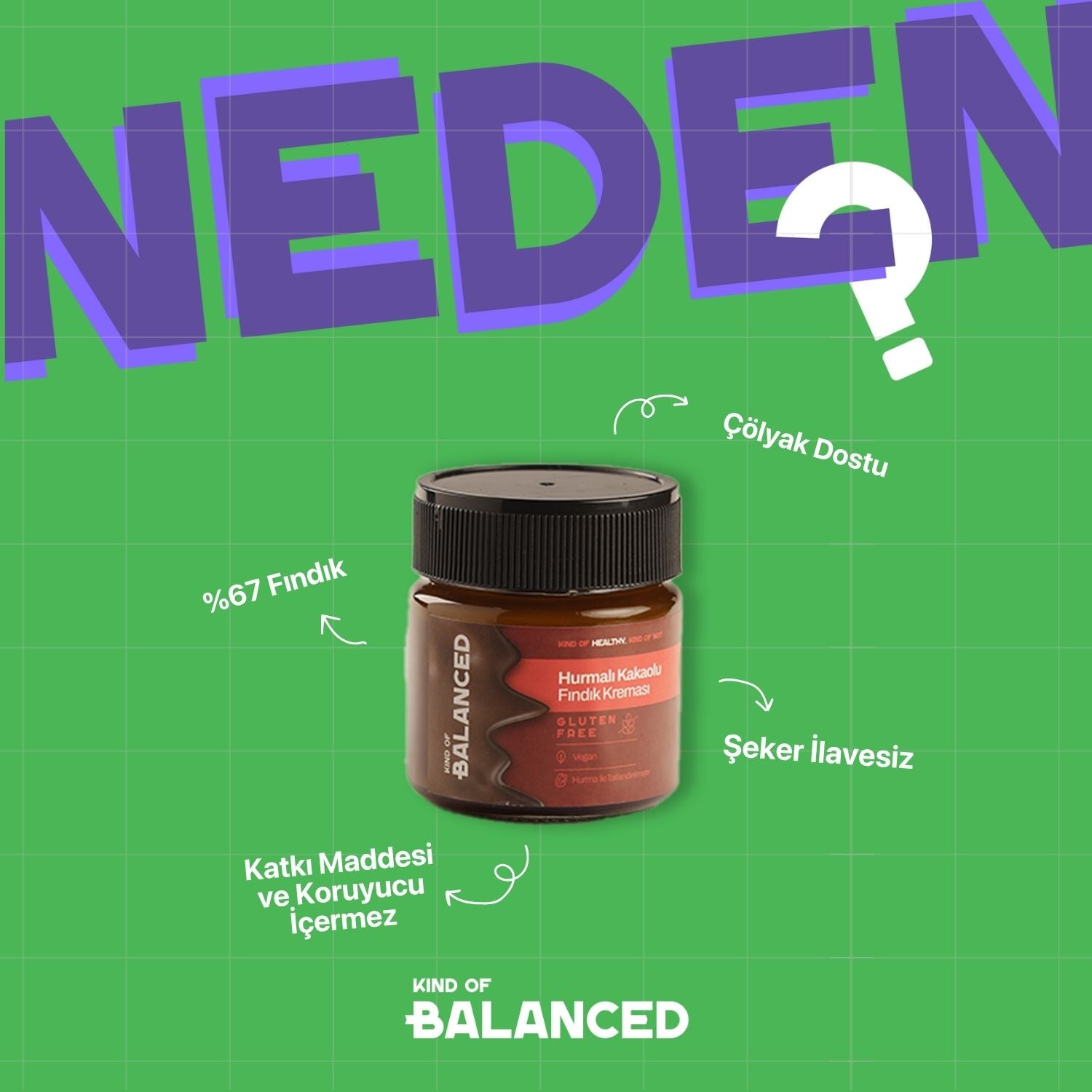 Fındık (%80), hurma özü (%17), kakao çekirdeği (%3).