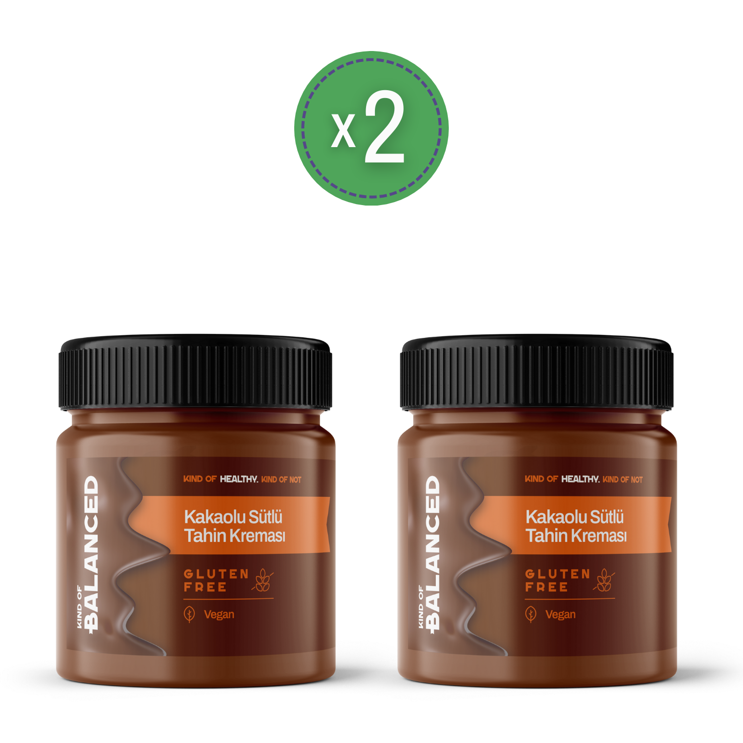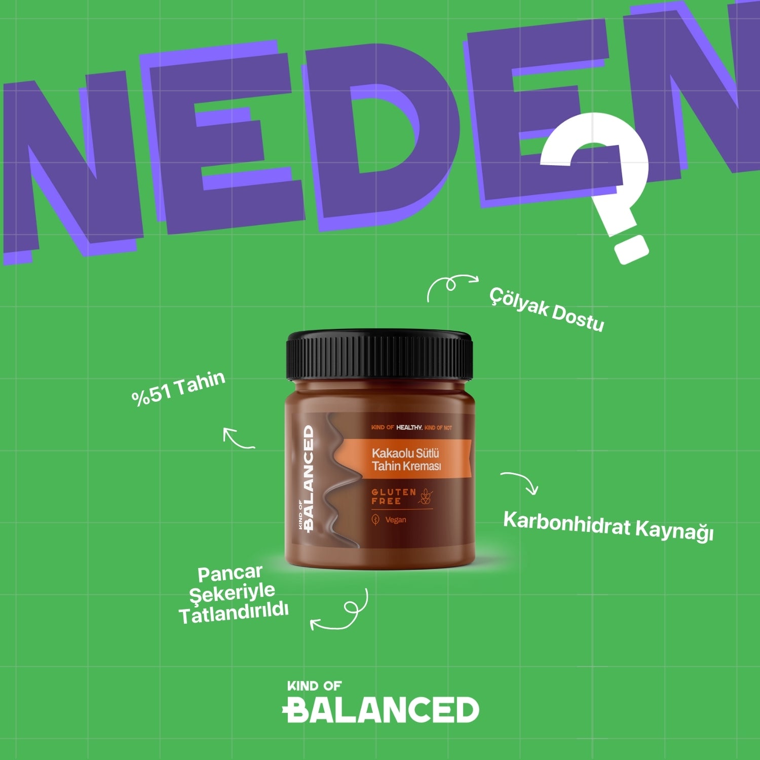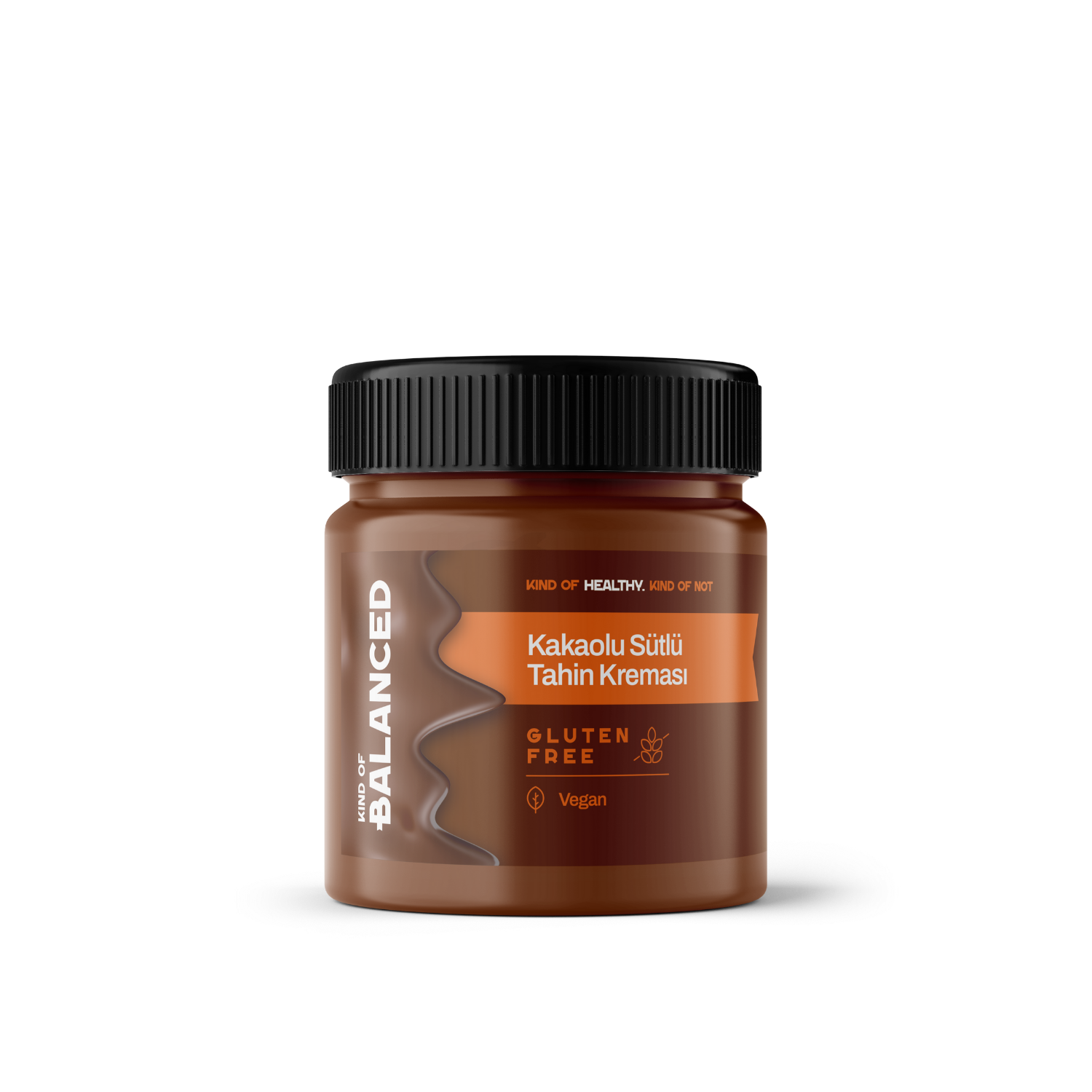 Kind Of Balanced Kakaolu Sütlü Tahin Kreması, tahinin zengin ve yoğun dokusunun kakao ve sütle harmanlanmasıyla elde edilen katkısız bir kremadır. Tahin (%51) ve tam yağlı süt tozu (%13) gibi temel bileşenlerle hazırlanan bu krem, kakao (%4) aromasıyla tatlı bir lezzet kazanır ve klasik sürülebilir tatlı kremalara daha doğal bir alternatif oluşturur. Sade içerikli yapısıyla günlük kahvaltılarda, atıştırmalıklarda veya tatlı tariflerde kullanılabilir.