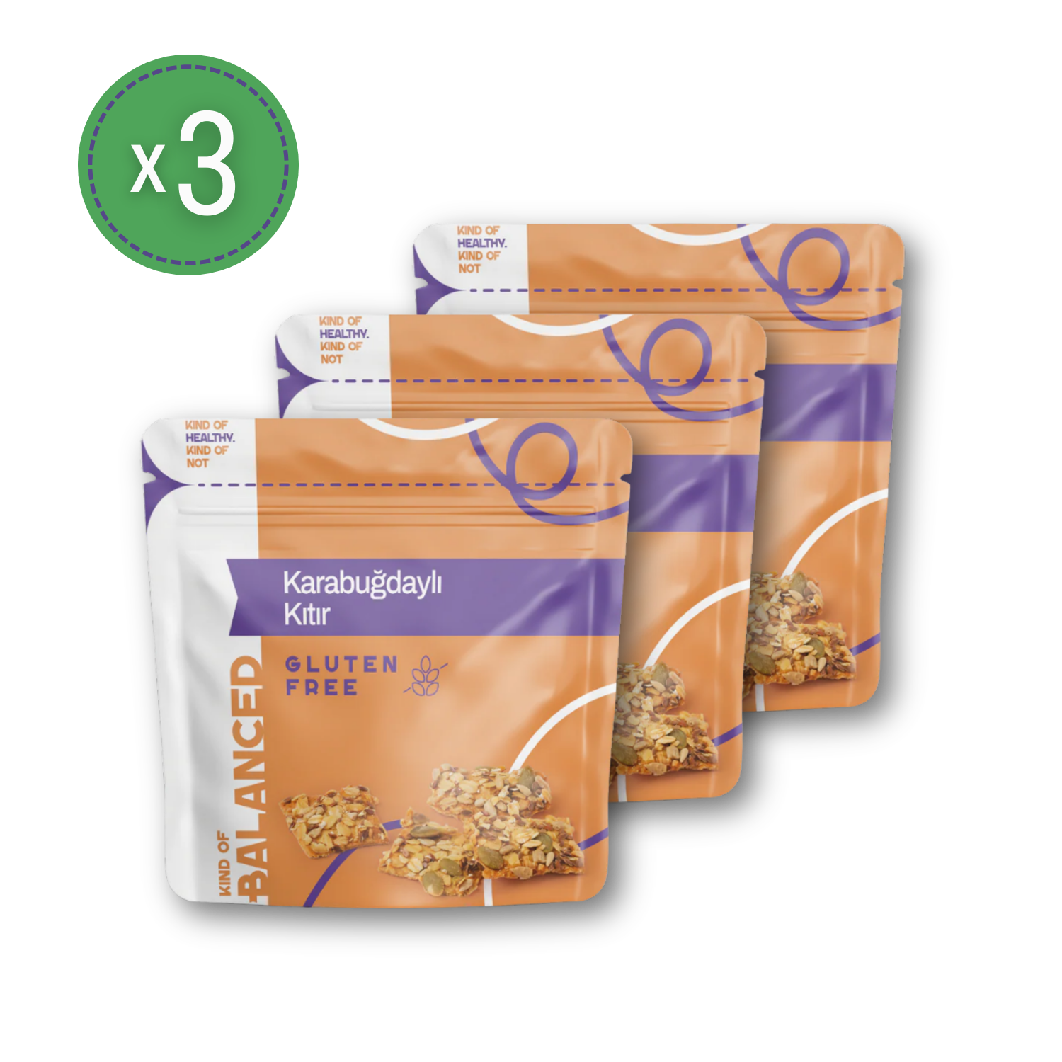 Kind Of Balanced Glütensiz Karabuğdaylı Kıtır, özenle seçilen gluten içermeyen karabuğday unu temel alınarak üretilir. Üretim sürecinde karabuğday unu (%51), doğal yağlar, ay çekirdeği ve kabak çekirdeği gibi çekirdekler, yulaf ezmesi, keten tohumu ve hurma suyu birlikte karıştırılarak kıtır kıvamına ulaşacak şekilde hazırlanır. Ürün rafine şeker, katkı maddesi veya koruyucu içermez; doğal içerikler dengeli bir şekilde işlenir ve kontrollü pişirme ile kıtır dokusu sağlanır.