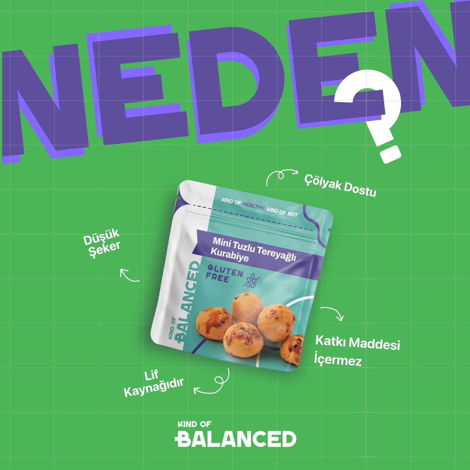 Kind Of Balanced Glütensiz Mini Tuzlu Tereyağlı Kurabiye, gluten içermeyen un karışımı ve doğal içeriklerle hazırlanan lezzetli bir atıştırmalıktır. Ürün mısır nişastası ve pirinç unu bazlı glütensiz un karışımı ile gerçek tereyağı (%24), yoğurt, yumurta ve hafif tuz dengesi ile tatlandırılır. Hindistan cevizi şekeri, mahlep, üzüm pekmezi, susam ve çörek otu gibi bileşenler sayesinde hem çıtır hem hafif aromatik bir dokusu olur. Bu kurabiye, günün her anında keyifle tüketilebilecek dengeli ve katkısız bir seçimdir.