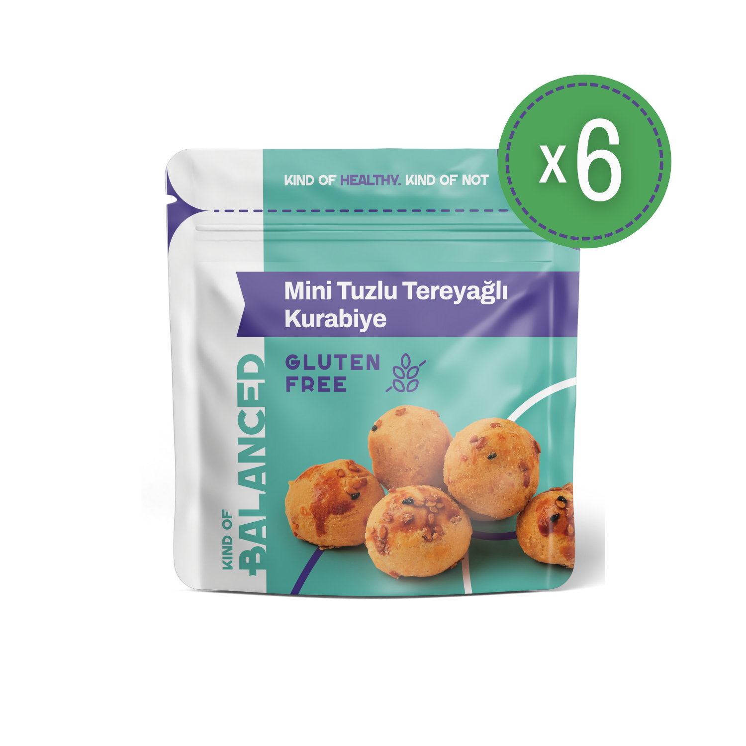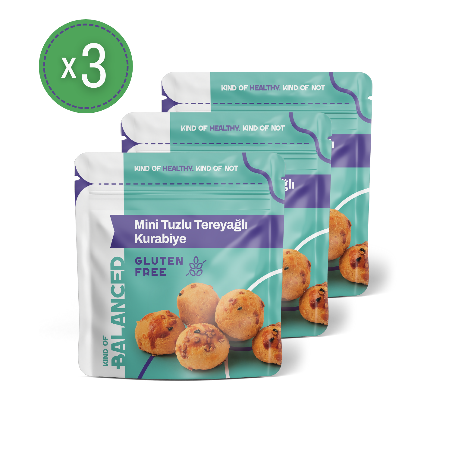 Kind Of Balanced Glütensiz Mini Tuzlu Tereyağlı Kurabiye üretimi, özenle seçilmiş glütensiz un karışımının tereyağı, ayçiçek yağı, yoğurt ve yumurta gibi taze içeriklerle harmanlanmasıyla başlar. Hamura az miktarda tuz ve doğal tatlandırıcılar — hindistan cevizi şekeri ve üzüm pekmezi — eklenir; mahlep gibi aromalarla lezzet zenginleştirilir. Hamur daha sonra kontrollü pişirme sürecinden geçirilir ve kurabiyelerin çıtır kıvamı ile doğal aroması korunur. Üretimde rafine şeker veya katkı maddesi kullanılmaz.