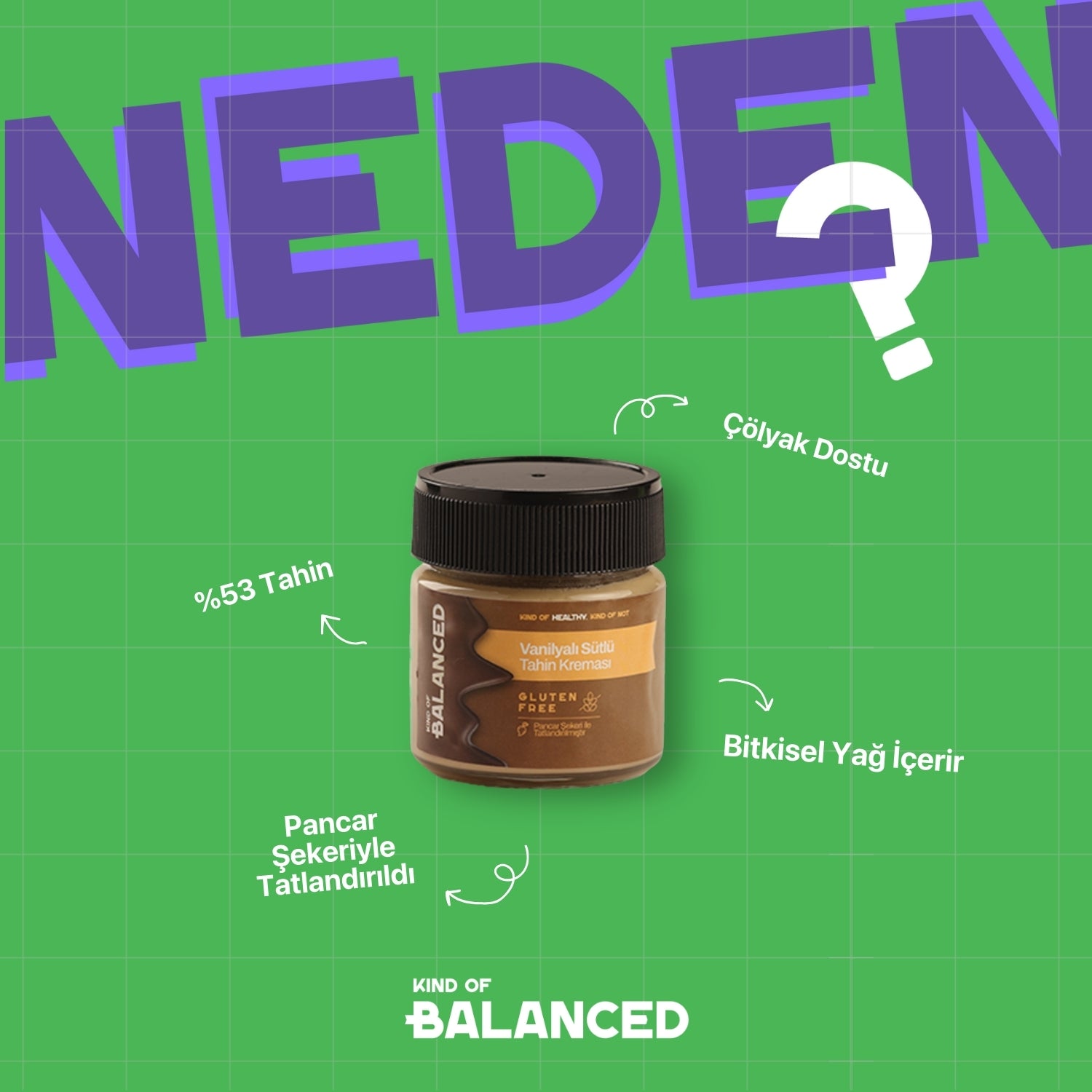 Tahin (%53), şeker, tam yağlı süt tozu (%13), bitkisel yağ (hindistan cevizi yağı), doğal vanilya aroması.
